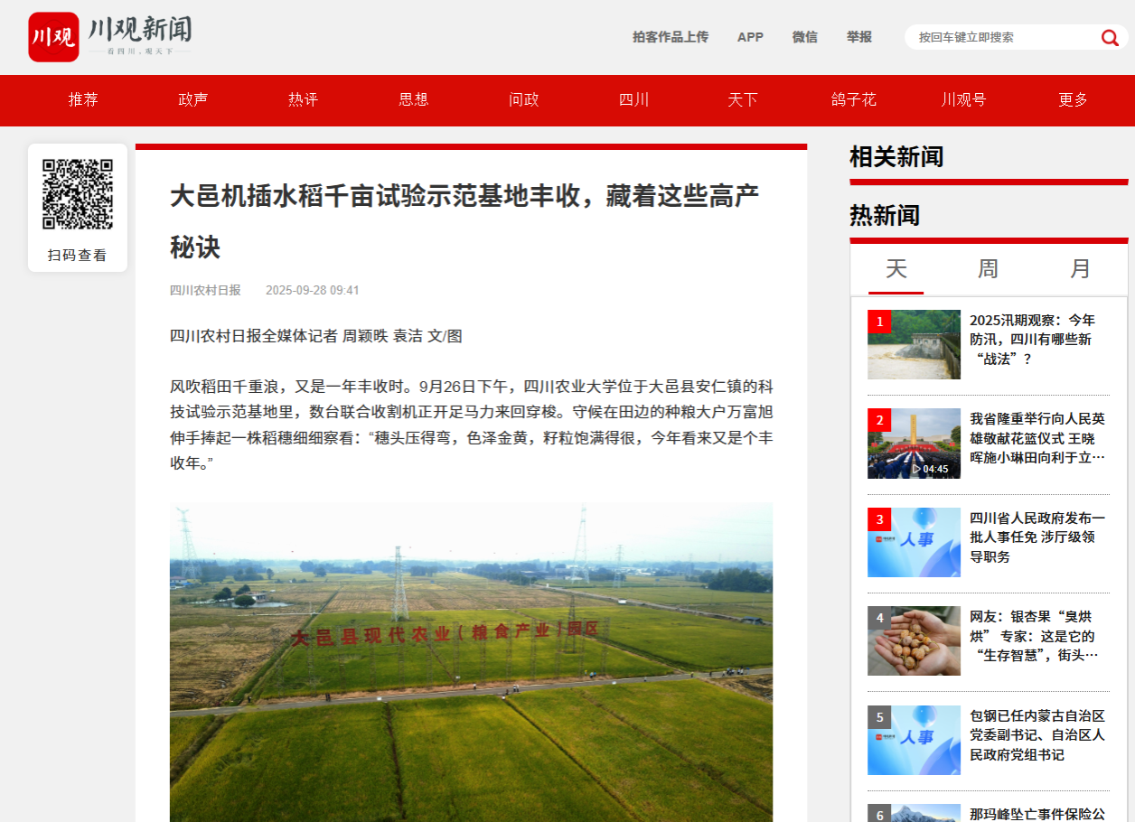 这一优异成绩,标志着全省农业重大技术协同推广——“大邑县水稻全程机械化绿色高效集成技术协同推广项目”取得了实质性进展。“实现高产的关键,在于我们优选了适宜机械化作业的品种,并实现了从齐苗壮根育秧、减穴稳苗栽插到水肥一体化管理增密促穗的全程机械化智能化作业。”项目技术首席专家、四川农业大学副教授陈勇表示,在此基础上,结合绿色高效栽培技术全程落实到田,最终实现了水稻的稳产高产。他拨开一丛稻株进一步说明,“这稻株根系发达、株型挺拔、穗多粒足,正是‘根冠协同’理想群体的直观体现。”